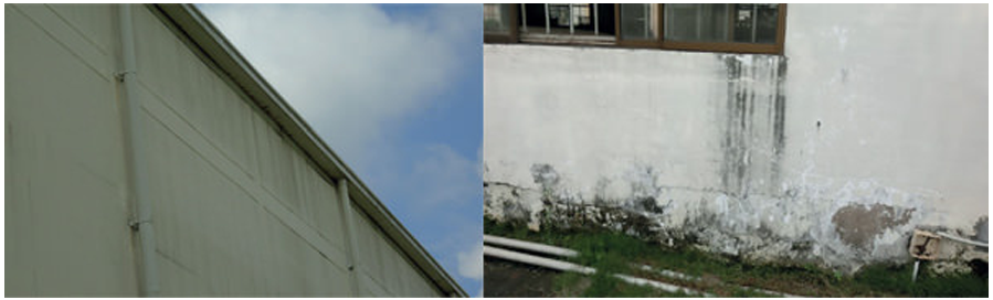 壁上部以外にも天井部から雨どいの部分や、窓枠の部分、会社名など壁に設置された文字盤などからも付着した汚れが雨水と共に壁に流れ出して壁を汚してしまいます。